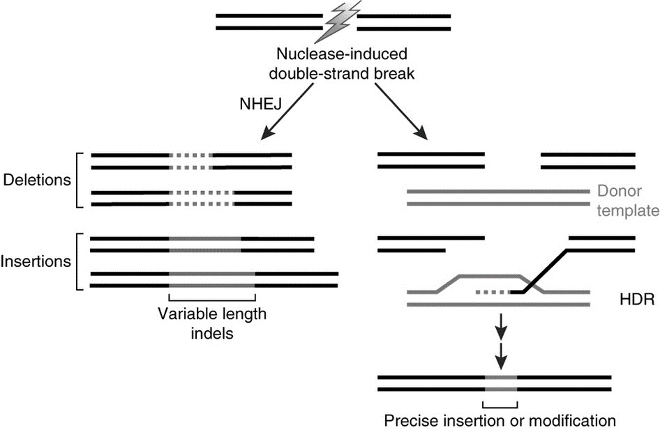 Genome or gene editing refers to the use of site-directed nucleases to precisely introduce a double stranded break at a predetermined location in the genome. The cell can repair that DSB break in one of two ways – nonhomologous end joining (NHEJ) or homologous-directed repair (HDR) using a nucleic acid template that includes the sequences homologous to either side of the double-strand break. The outcomes of these repair processes result in random mutations or precise gene edits, respectively (Figure 1).