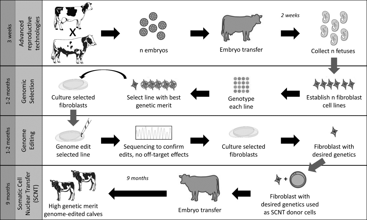 To become an important driver of genetic change, gene editing methods must seamlessly integrate with conventional animal breeding programs. That means that they must reliably function to germline-edit animals that are selected to be the next generation of parents. Edits can be introduced through gene editing of somatic cells followed by somatic cell nuclear transfer cloning, or injection of the gene editing reagents into the cytoplasm of single cell zygotes of the next generation. A potential approach to incorporate genome editing in current breeding programs through the use of advanced reproductive technologies are outlined in Figure 2.