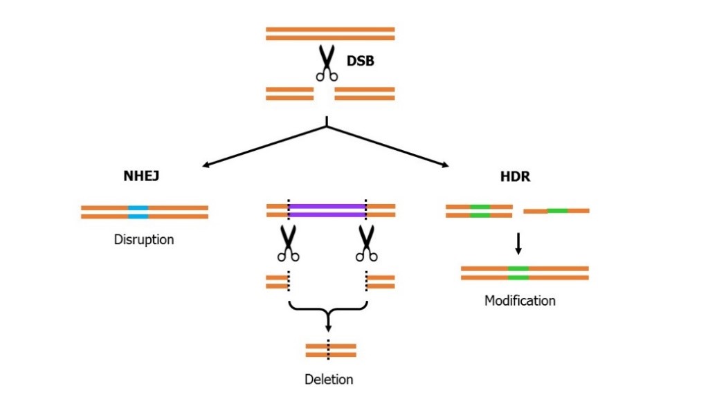 There are three types of editing event that can be created utilising genome editor generated DSBs. Non-homologous end joining which often leads to indels at the site of repair which can result in gene disruption. The homology dependant repair pathway allows the introduction of modifications at the site of repair by providing a single strand or a double stranded DNA molecule that acts as a scaffold for repair of the break. Genome editors can also remove an undesirable region of the genome by generating DBSs flanking the region, the repair of which leads to deletion of the intervening sequence.