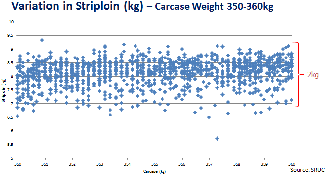 Figure 3: Variation in Striploin (kg) – Carcase Weight 350–360kg