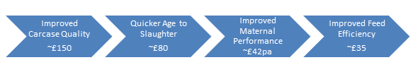 On a level arguably leaving more pounds directly in producers’ pockets, the genetic difference between the Top 1% and Bottom 1% animals for Age at Slaughter is 44 days. In other words, animals with Top 1% genetics for Age to Slaughter have the genetic potential to finish 44 days (approx. 6 weeks) faster than those in the Bottom 1% simply by dint of the fact they have inherited faster finishing genetics. A quick back-ofthe-envelope calculation suggests that the faster finished animals could be worth approximately £80 more (44 days at £1.80/day finishing cost) than their slower contemporaries and this is, without doubt, ‘added value from genetics’ at its best.