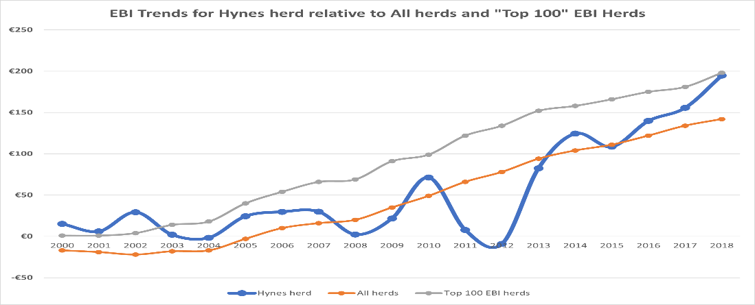 Figure 1: EBI Trends for Hynes herd relative to All herds and ‘Top 100’ EBI Herds.